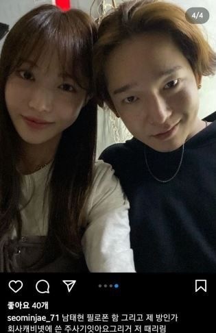 글과 함께 공개한 사진에는 서민재가 남태현과 얼굴을 맞대고 다정하게 셀카를 찍고 있는 모습이 담겨 있어요.