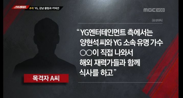 또 목격자는 YG측에서는 양현석과 유명소속가수가 직접 나와서 해외재력가들과 함께 식사를 하고 상당히 긴 시간동안 이야기를 나누었다고 기억하다고 진술을 했는데 여기까지는 그냥 해외 재력가들과 사업을 구상하려는 목적의 접대로 볼수 있겠지만 그 이후 상황이 이상했습니다.