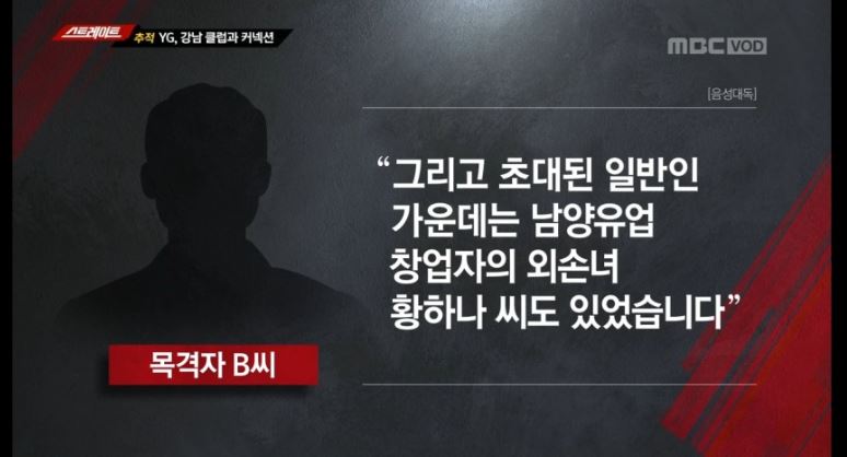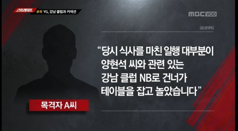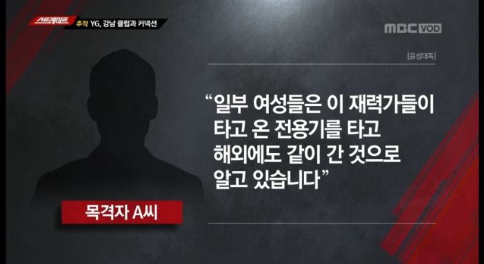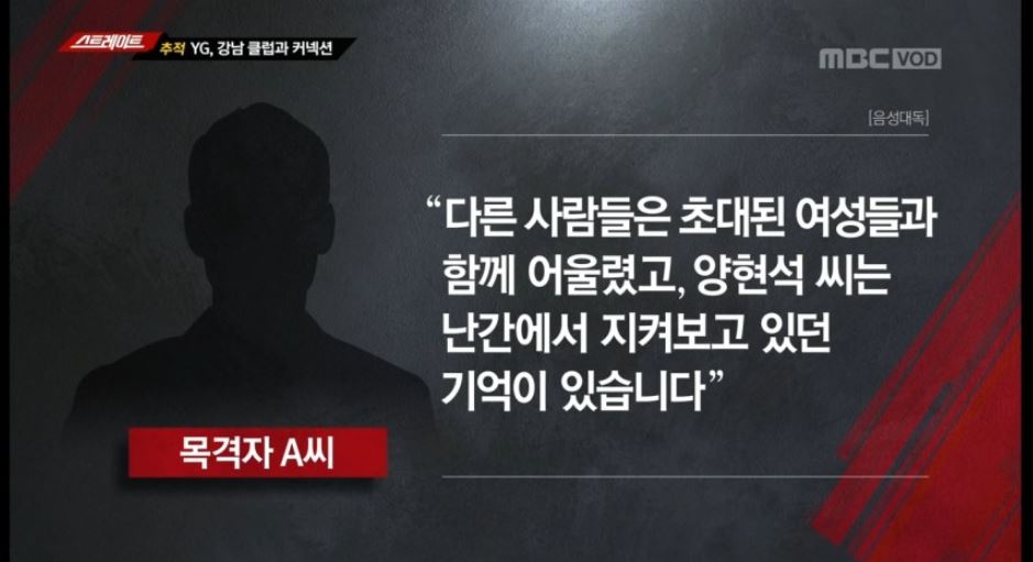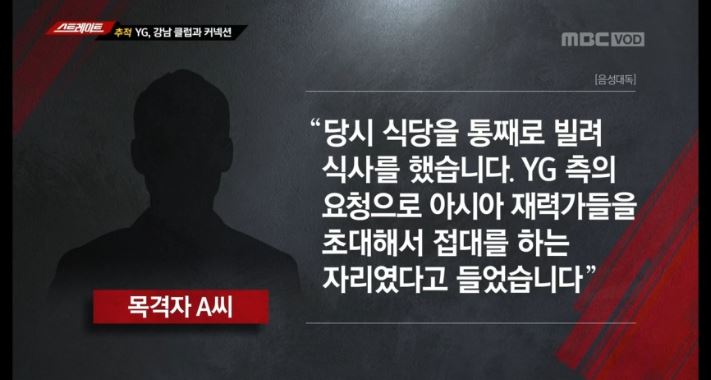 당시 목격자는 YG 사람들과 재력가를 포함한 남성 8명 정도가 식당 가운데이 앉아 있었고 그 주분으로 25명 정도 초대된 여성이 있었다는 것입니다.