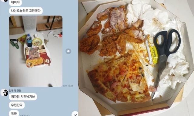 정주리는 21일 자신의 인스타그램에 남편과 메시지를 주고 받은 내용을 캡처해 게재했는데, 정주리가 공개한 게시물은 남편이 자신에게 사진을 보낸 것으로, 피자, 치킨 등이 담겨 있다.