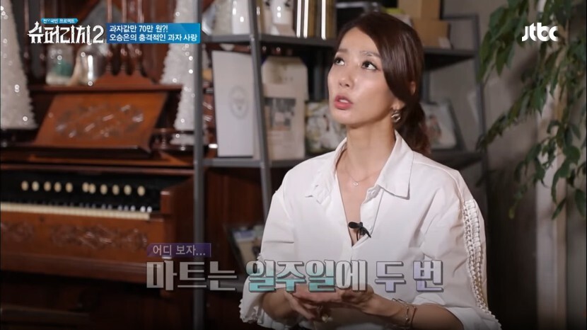 오승은씨는 과자에 대한 집착이 심한데, 마트에 두번 가면 과자값만 8,9만원이 나오고 한달에 70만원 과자값을 쓴다고 치면 10년이면 8500만원 정도 금액이 나온다고 합니다.