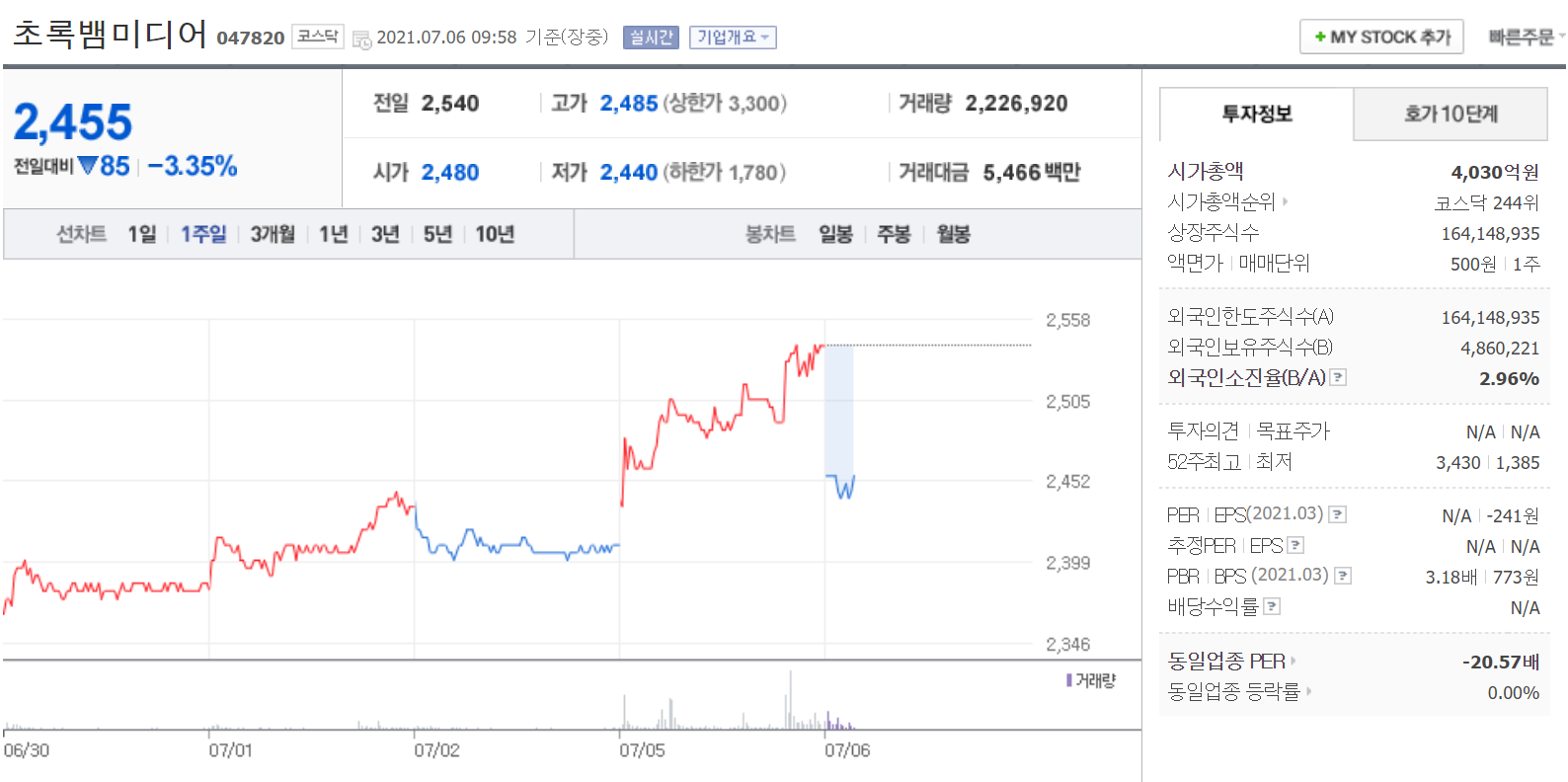 스카이이앤엠의 지분을 가지고 있는 초록뱀미디어 또한 관련주로 볼 수 있습니다. 초록뱀도 같은 이유로 하락한 것 같네요. 사실 초록뱀미디어는 드라마 펜트하우스의 제작사로 유명합니다. 저는 펜트하우스 시청자이기 때문에 초록뱀미디어를 사 두었으나... 지금 드라마도 처참하고... 제 계좌도 처참하네요... 주단태... 용서모태.
