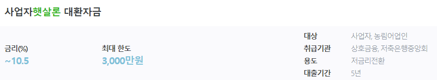 사업자 햇살론 대환자금의 한도는 최대 3000만원까지이며, 금리는 최대 10.5%의 금리가 적용될 수 있습니다.